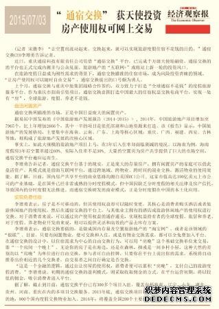 李增勇表示,通宿交换要做的,是做成国内存量及空置旅游地产的“淘宝网”,或者是该领域的“银联”。目前,只要有闲置物业,便可交换和入住,或是有物业交换需求,都可以全免费加入平台。